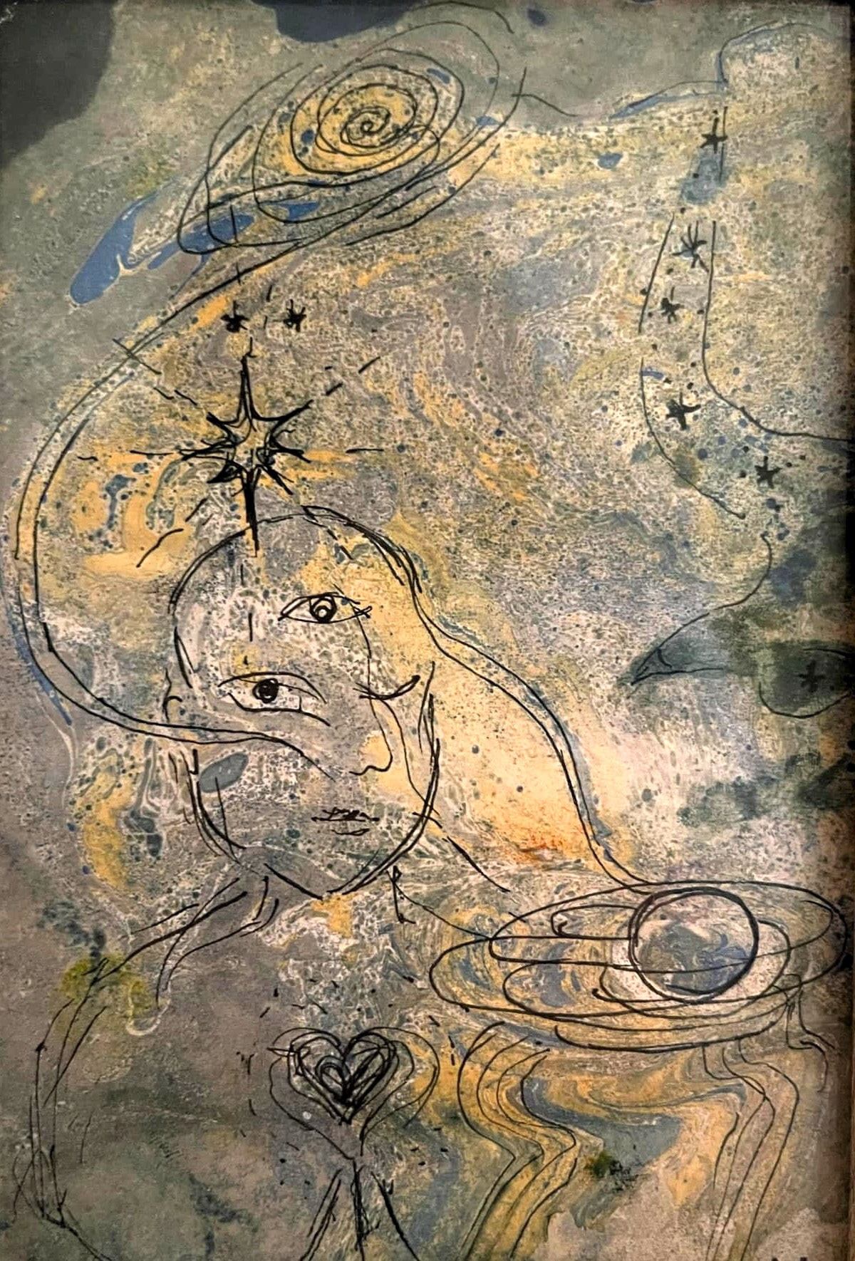 "Universal calling”, fine lines on marmered paper, A6 size, 2024.